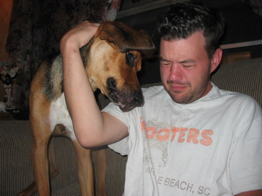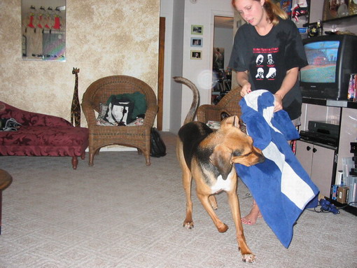 I've attached 3 pics of our Goat Dog. [The first] is a picture of the goat dog tearing into the Hulk. [The second picture] shows the moment directly after Crackergoat attacked my face. Note wound on the chin. And the anguish. [The third] shows my fiancée fending off his vicious attack with a towel. This move has saved our life many times. Notice she is covered in his saliva.