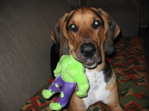 Much like our cat who we believe to be a dog trapped in a cat's body, we believe our dog, Cracker Too, to be a goat trapped in a dog's body. All of the warning signs are there. Often times, he will allow us to scratch his ears so he can attempt to eat our fingers off. Whenever my fiancée or myself arrive home from work we spend 15 minutes dodging him as he performs various Tony Hawk moves off of the furniture in an attempt to kill us. The realization of his goatness came when we witnessed with our own eyes, Cracker savagely devouring an Auburn University baseball hat, a tennis ball, wads of string from towels and the Incredible Hulk. Nothing is sacred.