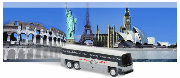 It's that time again! As everyone knows, June is Goat Trauma Awareness Month and in observation of this, the CGTF will send out it's minions across the countryside for the fourth year running to educate the populace as to the dangers of Childhood Goat Trauma. Based on input from last year's tour, as well as emails received at our Tour Request address (tour@goat-trauma.org), we have once again put together a nationwide, multi-city tour intended to reach to the heart of Childhood Goat Trauma. As before, we will be offering both classes and counseling at each of our tour stops. A selection of CGTF merchandise will be available as well.